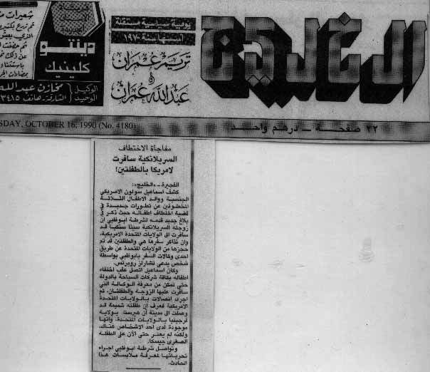 Al Khaleej newpaper published this Arabic language article about the kidnapping of my daughter, Shamema, which had occurred on October 7, 1990.