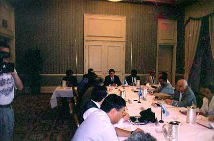 Igor, the cameraman, is in the left corner. Around the table clockwise, I do not know the man in the whiote shirt (possibly Alexi Orlov of Russian), Willy Iclicki (Belgium), Boris Kutin (Slovenia), General Secretary Noureddine Tabbane (Tunisia), Vice-President Stephen Doyle (USA), Vice President Ummer Koya (India), I don't know the next one, President Kirsan Ilyumzhinov (Russia), Executive Director Emmanuel Omuku (Nigeria), Honorary President Florencio Campomanes (Philippines), I don't know the next one, Continental President (Asia) Khalifa Al-Hitmi (Qatar), I don't know and Polina Tsedenova of Kalmykia.