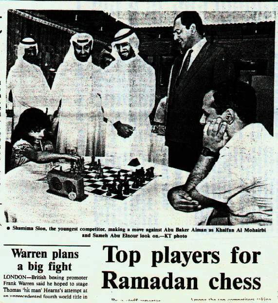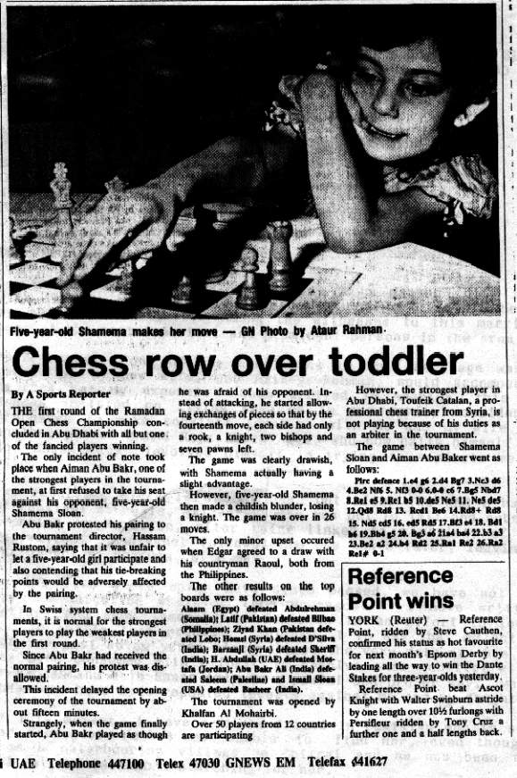 [Event "Ramadan Open"] [Site "Abu Dhabi"] [Date "1987.05.12"] [Round "01"] [White "Sloan,Shamema Honzagool"] [Black "Abu Bakr,Aiman"] [Result "0-1"] [ECO "B08"] 1.e4 g6 2.d4 Bg7 3.Nc3 d6 4.Be2 Nf6 5.Nf3 O-O 6.O-O c6 7.Bg5 Nbd7 8.Re1 e5 9.Rc1 b5 10.dxe5 Nxe5 11.Nxe5 dxe5 12.Qxd8 Rxd8 13.Rcd1 Be6 14.Rxd8+ Rxd8 15.Nd5 cxd5 16.exd5 Rxd5 17.Bf3 e4 18.Bd1 h6 19.Bh4 g5 20.Bg3 a6 21.a4 bxa4 22.b3 a3 23.Be2 a2 24.b4 Rd2 25.Ra1 Rxe2 26.Rxa2 Re1# 0-1Here is the Gulf News article in full text: