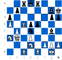 This time, as Eade played a theoretical game (and did not play like a moron), some comments about his opening are appropriate. The game followed a standard line of the French Defense played by Timman and others. However, on move 11, Black usually plays either Bxd4 or Nxd4 followed by 12. ... b5. Black has had good results with this. Instead, Eade played the more passive 11. ... Qc7. White's 12. g4 seems to be an improvement over the 12. h4 which has been played in other games. White quickly obtained the following overwhelming position: