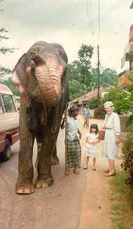 An elephant on the street on the road to Kandy Sri Lanka, along with Shamema Honzagool Sloan and Dr. Helen Marjorie Sloan