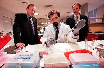 ![]() Michael West, left, Jose Cibelli, center, and Jim Robl at Advanced Cell Technology in Worcester, Mass. The small biotechnology company says it has found a method that may be used to grow human replacement tissue. |