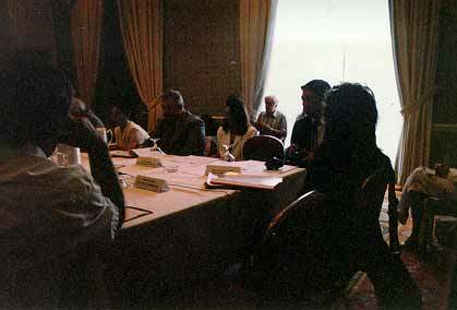On near side of the table is Israel Gelfer (Israel). Across the table is Polina Tsedenova of Kalmykia, Gaguik Oganessian (Armenia) with his lovely daughter, Tatevik, as translator, Ratings Administrator Casto Abundo (Philippines), and Barbara DeMaro, Executive Assistant of the United States Chess Federation.