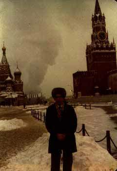 Sam Sloan standing in Red Square in front of the Kremlin in Moscow, 1977