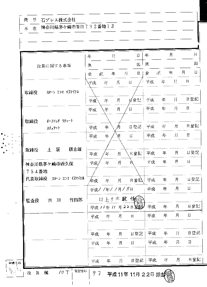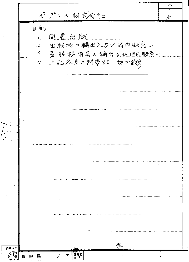 Ishi Press is a Kabushiki Kaisha, which means that it is a corporation which can do everything. I am the Daihyo Torishimari Yaku, which means that I am the director who represents the company. The document itself is called a Tokiboto, which means Company Registration Document.